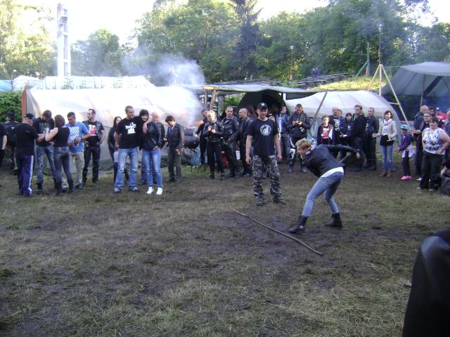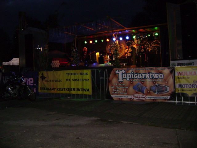 Piątkowy wieczór upłynął nam głównie pod znakiem powitań, bo oprócz znajomych, których już zastałem w Krasnymstawie, dojeżdżali ciągle "nasi" (Przemyśl i Lubaczów) - w sumie 8 motocykli i dwa auta "wsparcia", czyli kilkanaście osób. Motocykle można było postawić na parku maszyn, albo wjechać na pole namiotowe, co też zrobiliśmy. Nie zdarzyło się, żeby ktoś w nocy na bani usiłował jeździć, albo katował silnik do odcinki. Wieczorem ognisko, koncerty na dużej scenie i na małej, czyli tradycyjnie już chyba w Krasnymstawie na pace żuka. Trzeba przyznać, że organizatorzy zabezpieczyli opał, nie trzeba było nic samemu kombinować, ani chodzić, prosić o parę szczapek. Przygotowane tez były miejsca do siedzenia itd.